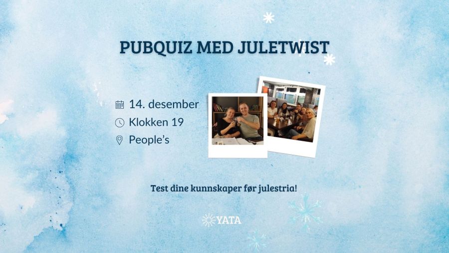 YATA Oslo inviterer til Pubquiz med en juletwist! Test dine kunnskaper før julestria – vi lover forskjellige kategorier og gode spørsmål! Dato: 14. desember Tid: 19:00 – 21:00 Hvem kan delta?Alle er velkomne, uansett om du er en utenrikskjenner eller bare elsker quizer! Inviter med deg noen eller finn sammen medFortsett å lese «14/12 Pubquiz med juletwist» - 1/11 Utenrikspolitisk X Flaut å vite quiz