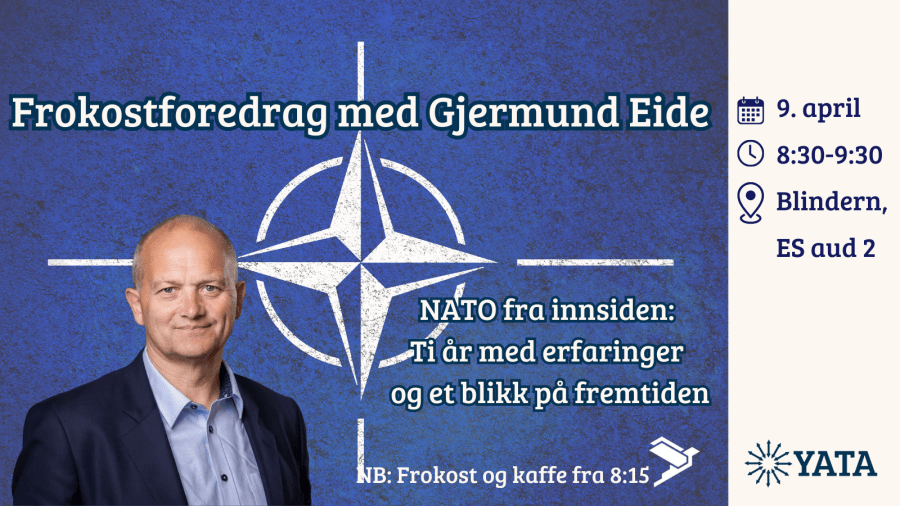 Gjermund Eide NATO fra innsiden: Ti år med erfaringer og et blikk på fremtiden Blindern, Eilert Sundts hus, auditorium 2 Onsdag 9. april, kl 08:30-09:30, frokost fra 08:15. YATA Oslo og Samfunnsviterne inviterer til et frokostforedrag med Gjermund Eide, tidligere militærrådgiver for Jens Stoltenberg i hans ti år som NATOsFortsett å lese «Frokostforedrag med Gjermund Eide» - Pils og prat med YATA Oslo